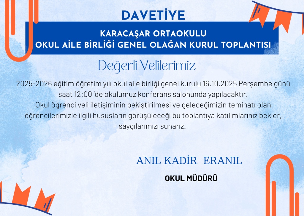 2025-2026 eğitim öğretim yılı okul aile birliği genel kurulu 16.10.2025 Perşembe günü saat 12:00 ‘de okulumuz konferans salonunda yapılacaktır.Toplantı davetiyesi ve gündem maddeleri aşağıya eklenmiştir.